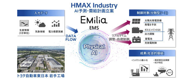 日立、フィジカルAIで電力需給を予測・最適化・自動制御するHMAX IndustryのEMS「EMilia」を、自動車工場向けにトヨタ自動車東日本と共同で機能拡張し、納入