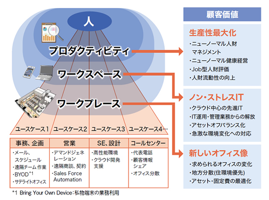 かつてない規模と期間でテレワークを実践し続ける中で見えてきたのは、コロナ禍の前に想定していたIT運用やセキュリティの課題だけでなく、安心して働ける場所の在り方や、生産性を高めるための従業員のパフォーマンスケアも含め、すべての環境を“Afterコロナ”を見据えたニューノーマルな働き方として再設計する必要があるということでした。
