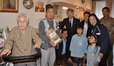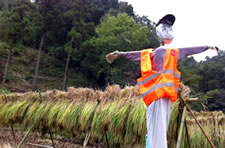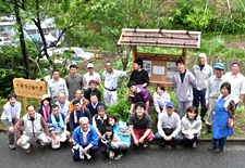 このスタンドは、日立ITエコ実験村関係者、「千村生き物の里」を管理する運営協議会、千村ネイチャー倶楽部のメンバーがひとつずつ手作りしたものです。木目の色や焼き印の押し具合など、どれも個性的な仕上がりになっています。