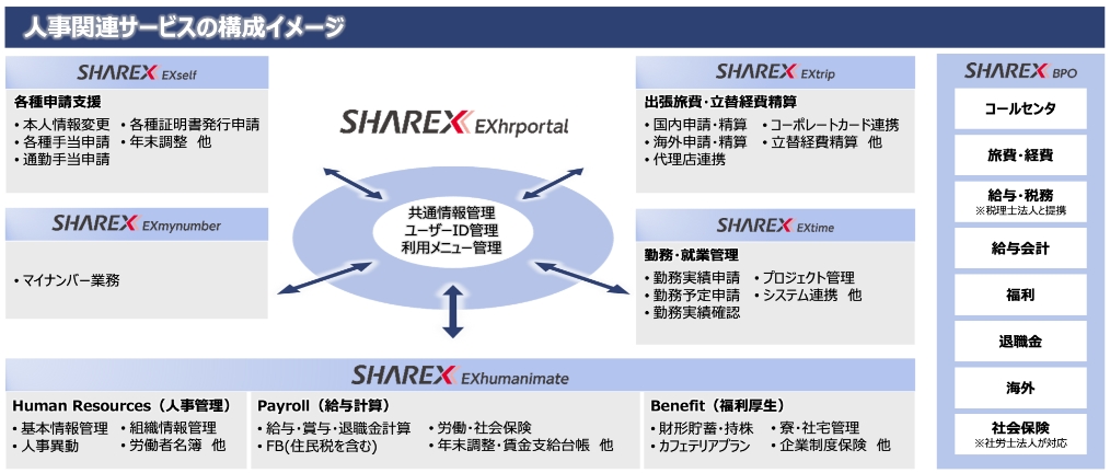 当社は、人事関連システム「SHAREX」をSaaS形式で提供しています。基幹系システム「SHAREX EXhumanimate」では、日立グループ約200社の従業員データを一元管理し、毎月の給与計算をスムーズに行います。フロント系システムでは、従業員が勤怠情報や手当申請を簡単に行うことができ、業務効率を向上させます。これらのシステムは連携することで、より大きな効果を発揮します。また、各社の人事制度などに応じて柔軟に設定変更することもでき、従業員が使いやすい環境を提供しています。