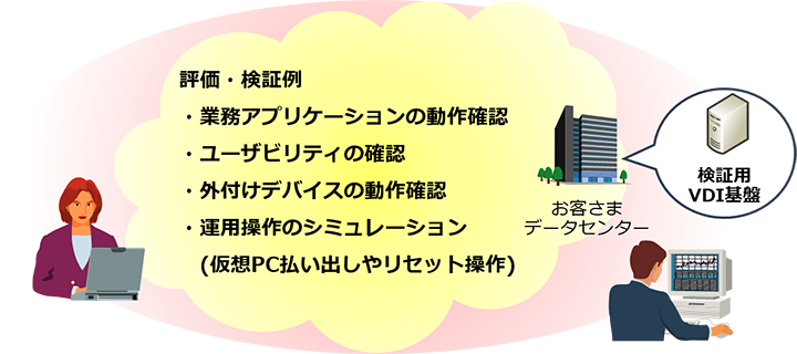 最大30ユーザー程度の検証用仮想デスクトップ環境をお客さま指定のデータセンターにご用意いたします。評価環境は最大約2か月間ご利用いただけます。