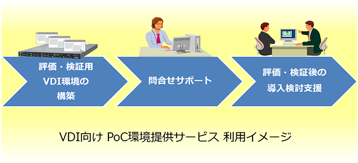 VDIの導入をご検討の方に、評価・検証にご利用いただける小規模環境を低価格にて短期間提供するサービスです。使い勝手や運用面など、課題となる点をあらかじめ実機で確認いただくことで、VDIの導入検討を円滑に進めることが可能となります。